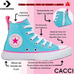 O tradicional Converse All Star de cano alto para os pequenos. Confeccionado em tecido de algodão canvas tipo lona, em cores contrastantes. Possui fechamento prático na parte externa dos canos. O tradicional logo Converse All Star Chuck Taylor é aplicado na parte interna dos canos, e na Heel Logo é aplicado o logo Converse All Star. Todos os ilhoses são prateados. Os dois ilhoses laterais permitem uma transpiração adequada aos pés. Os cadarços ajudam a manter o tênis justo ao pé. Possui puxador no calcanhar, que facilita a colocação do tênis. Com solado de borracha e palmilha macia, pensada especialmente para os pés mais sensíveis.