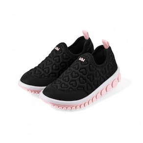 Nosso modelo, em preto e rosa com charmosos corações em relevo, tem um design moderno e é ideal para as aventuras das pequenas. Feito de elastano respirável e fácil de limpar, ele se ajusta bem, é confortável e possui um solado inovador que segue o movimento do pé. A palmilha Fisioflex é macia e simula o andar descalço, garantindo conforto extremo.