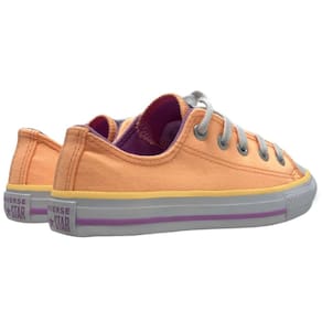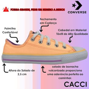 O clássico Chuck Taylor All Star na versão kids é confeccionado em tecido canvas de algodão tipo lona e vem nesta edição em cores sazonais. Nesta temporada, as cores da tendência escolhidas para compor a coleção, trazem o sentimento de calma, estabilidade e esperança. Possui costuras duplas, uma tira de tecido no calcanhar que proporciona maior suporte ao tênis e ilhoses na cor prateada, com dois ilhoses laterais para uma transpiração adequada aos pés. A tag com a logo Chuck Taylor All Star aparece em um degradê de cores e é aplicado na língua, enquanto a heeltab é aplicada no calcanhar. O solado vulcanizado garante a aderência adequada ao caminhar.