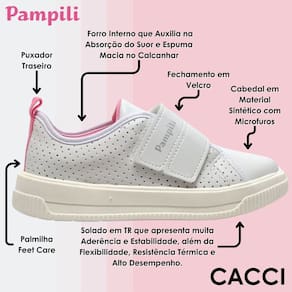 Tênis escolar infantil em material sintético com perfuros, perfeito para acompanhar a menina em sua rotina! Forro interno que auxilia na absorção do suor e espuma no calcanhar, trazendo um super conforto para os pezinhos durante o uso na escola ou passeios.