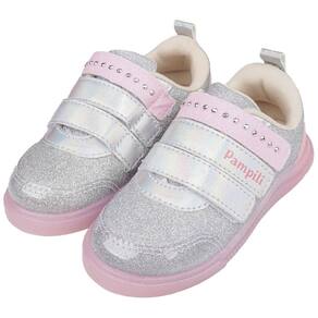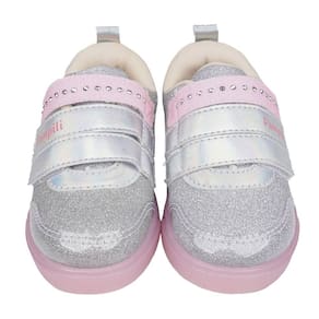 Tênis infantil feminino em glitter prata com recortes em material sintético e aplicação de strass metalizados em hotfix na parte superior, fofo para o dia a dia!