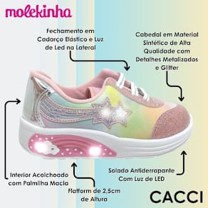 Com o Tênis Infantil Luz Estrela da Molekinha, sua pequena vai brilhar e se destacar em qualquer lugar! Um tênis cheio de luzes, glitter e conforto, perfeito para acompanhar todas as aventuras com muito estilo. Garanta o seu agora e traga mais brilho para o dia a dia da sua menina!