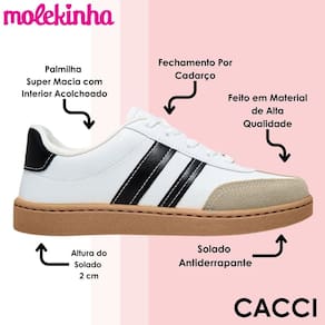 O Tênis Molekinha Infantil Menina possui cabedal em material sintético de alta qualidade, com coloração uniforme e detalhes discretos que proporcionam um visual clean. Seu formato apresenta bico arredondado, ideal para acomodar os pés das crianças com conforto. O fechamento é feito por cadarço, garantindo um ajuste firme e seguro, enquanto a abertura facilita o calce. Com construção ergonômica, o tênis oferece palmilha macia e calcanheira acolchoada, promovendo bem-estar durante o uso. O forro interior é suave, evitando atritos, e o solado de borracha assegura durabilidade e flexibilidade. Seu design leve e maleável permite liberdade nos movimentos, e os pequenos detalhes em costura nas laterais agregam estilo e delicadeza ao visual.