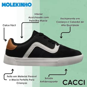 O Tênis Molekinho foi feito para os pequenos que não abrem mão de estilo e conforto em qualquer ocasião. Com design moderno e cheio de personalidade, esse modelo traz praticidade no dia a dia e combina com os mais variados looks, deixando o visual dos meninos ainda mais descolado.