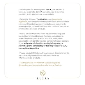 O Olympikus Metro é o tênis ideal para quem busca maior conforto nos corres diários. O seu solado possui a tecnologia ELEVA +, que explora o limite de expansão do EVA para alcançar o máximo conforto, amortecimento e durabilidade. Já o cabedal é feito em Tecido Knit com Tecnologia Hypersox, que proporciona respirabilidade e flexibilidade e leveza. O tecido traseiro é moldado com espuma de alta espessura, trazendo além de alto conforto, um visual sofisticado e clean ao produto. Possui ainda atacador e forro em poliéster, lingueta confortável em tecido dupla frontura com espuma, puxador traseiro para auxiliar no calce, sistema de amarração com cordão na vista com detalhes de costura zigue, etiqueta minimalista em high frequency e palmilha plana composta por tecido poliéster e EVA, com aplicação gráfica. Possui ainda QR Code na lingueta, com direcionamento para uma página exclusiva contendo todas as informações do produto. TECNOLOGIAS: HYPERSOX- A tecnologia da Olympikus em formato de meia, leve e flexível. Fácil Ean: 7894756447041