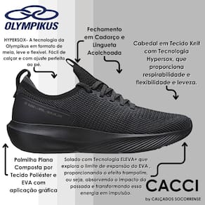 TECNOLOGIAS: HYPERSOX -A tecnologia da Olympikus em formato de meia, leve e flexível. Fácil de calçar e com ajuste perfeito ao pé. ELEVA+ -Tecnologia exclusiva Olympikus, que explora o limite de expansão do EVA para alcançar máxima resposta, proporcionando o efeito trampolim, ou seja, absorvendo o impacto da passada e transformando essa energia em impulsão. Este EVA é leve e de baixa densidade, garantindo menor deformação e mantendo o conforto e a durabilidade.