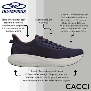 Tecnologias: Hypersox - A tecnologia da Olympikus em formato de meia, leve e flexível. Fácil de calçar e com ajuste perfeito ao pé. Eleva + -Tecnologia exclusiva Olympikus, que explora o limite de expansão do EVA para alcançar máxima resposta. Este EVA é leve e de baixa densidade, garantindo menor deformação e mantendo o conforto e a durabilidade.Gripper -Borracha antiderrapante que garante melhor aderência