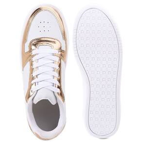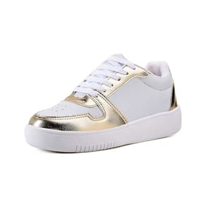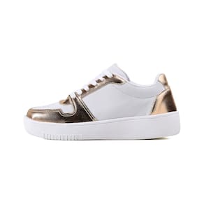 Tênis confeccionado com material sintético na cor branco com detalhes em material sintético metalizado e palmilha confort.