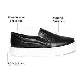Tênis Slip On feminino confeccionado em material têxtil, com solado baixo branco flatform com o nome da marca na parte traseira e bico arredondado. Possui elásticos nas laterais para facilitar o calce, detalhe placa do logotipo na lateral do cabedal. O tênis slip on é uma opção elegante e confortável para quem procura um calçado fácil de usar e que combine com diferentes estilos de roupa.