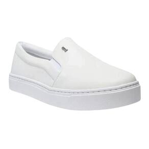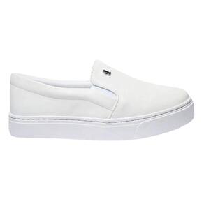 Tênis Slip On feminino confeccionado em material têxtil, com solado baixo branco flatform com o nome da marca na parte traseira e bico arredondado. Possui elásticos nas laterais para facilitar o calce, detalhe placa do logotipo na lateral do cabedal. O tênis slip on é uma opção elegante e confortável para quem procura um calçado fácil de usar e que combine com diferentes estilos de roupa.