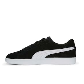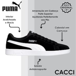 O detalhe do logo Puma aparece em dourado nas laterais, línguas e nos calcanhares do tênis.