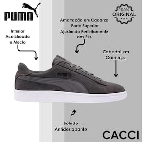 O detalhe do logo Puma aparece em dourado nas laterais, línguas e nos calcanhares do tênis.