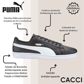O modelo com design casual e moderno, possui cabedal em poliéster, fechamento em cadarço, solado emborrachado e resistente e logo Puma aplicado na lateral.