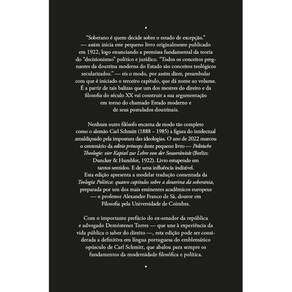 \"Soberano é quem decide sobre o estado de excepção.\" assim inicia este pequeno livro originalmente publicado em 1922, logo enunciando a premissa fundamental da teoria do \"decisionismo\" político e jurídico. \"Todos os conceitos pregnantes da doutrina moderna do Estado são conceitos teológicos secularizados.\" eis o modo, por assim dizer, preambular com que é iniciado o terceiro capítulo, que dá nome ao volume. É a partir de tais balizas que um dos mestres do direito e da filosofia do século XX vai construir a sua argumentação em torno do chamado Estado moderno e de seus postulados doutrinais. Nenhum outro filósofo encarna de modo tão completo como o alemão Carl Schmitt (1888 1985) a figura do intelectual amaldiçoado pela impostura das ideologias. O ano de 2022 marcou o centenário da editio princeps deste pequeno livro Politische Theologie: vier Kapitel zur Lehre von der Souvernitát (Berlin: Duncker Humblot, 1922). Livro estupendo em tantos sentidos. E de uma influência indizível. Esta edição apresenta a modelar tradução comentada da Teologia Política: quatro capítulos sobre a doutrina da soberania, preparada por um dos mais eminentes acadêmicos europeus o professor Alexandre Franco de Sá, doutor em Filosofia pela Universidade de Coimbra. Com o importante prefácio do ex-senador da república e advogado Demóstenes Torres que une à experiência da vida pública o saber do direito , esta edição pode ser considerada a definitiva em língua portuguesa do emblemático opúsculo de Carl Schmitt, que abalou para sempre os fundamentos da modernidade filosófica e política. Marca: Livraria Resistência Cultural Editora