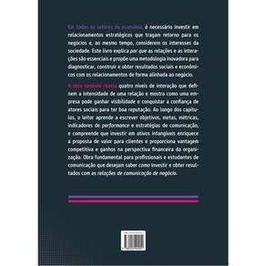 Em todos os setores da economia, é necessário investir em relacionamentos estratégicos que tragam retorno para os negócios e, ao mesmo tempo, considerem os interesses da sociedade. Este livro explica por que as relações e as interações são essenciais e propõe uma metodologia inovadora para diagnosticar, construir e obter resultados sociais e econômicos com os relacionamentos de forma alinhada ao negócio. A obra também revela quatro níveis de interação que definem a intensidade de uma relação e mostra como uma empresa pode ganhar visibilidade e conquistar a confiança de atores sociais para ter boa reputação. Ao longo dos capítulos, o leitor aprende a escrever objetivos, metas, métricas, indicadores de performance e estratégias de comunicação, e compreende que investir em ativos intangíveis enriquece a proposta de valor para clientes e proporciona vantagem competitiva e ganhos na perspectiva financeira da organização. Obra fundamental para profissionais e estudantes de comunicação que desejam saber como investir e obter resultados com as relações de comunicação de negócio e para empresários que desejam compreender o processo de relações públicas para melhorar seu desempenho nos negócios e diante do consumidor.