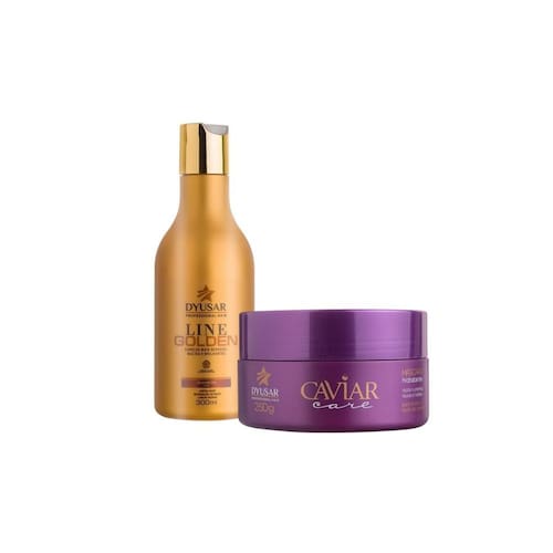 O Shampoo Ouro Line Golden DYUSAR Hair limpa suavemente os fios deixando os cabelos fortalecidos e revitalizados. modo de usar: Aplique sobre os cabelos molhados massageando bem até formar espuma. Enxague e se necessário repita a aplicação. A Máscara Caviar Care foi desenvolvida especialmente para todos os tipos de cabelos, auxilia a repor os nutrientes perdidos por processos químicos e agressões externas enquanto repara e hidrata. Elaborada com Queratina, Argan e Caviar, possui ação reparadora, hidratante e nutritiva. Promove reposição dos nutrientes vitais do cabelo, desembaraço, reduz o frizz, proporcionando cabelos macios, sedosos e com brilho intenso. Livre de parabenos. Modo de Usar: Aplicar sobre os cabelos molhados e limpos. Começar pelas pontas, massageando suavemente os cabelos e deslizando os fios entre os dedos até que estejam desembaraçados. Deixe agir de 5 a 10 minutos e enxaguar bem. Marca: Não Informado