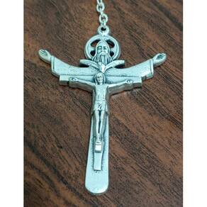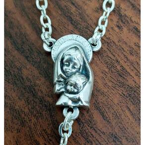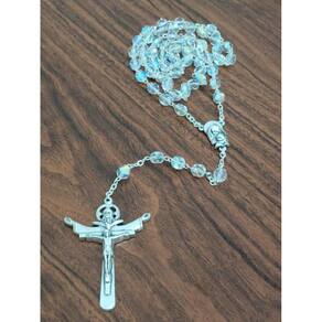 Este lindo terço é feito de contas facetadas redondas branca de 7 mm de vidro de cristal transparente lapidada, sua peça central apresenta Nossa Senhora e o Menino Jesus na frente, e o Sagrado Coração de Jesus no verso e um Crucifixo da Santíssima Trindade. Na parte de trás do crucifixo estão as palavras "Tertium Millennium", que celebra o martírio. O milênio de Tertium é o terceiro milênio depois de Cristo. Este crucifixo é fundido e oxidado com prata para um melhor acabamento. Com cerca de 52 cm de altura. Marca: San Gregorio - Artigos Religiosos