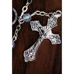 Este lindo terço Italiano, apresenta contas de cristal econômico branco. No centro uma Medalha de Nossa Senhora na frente e o Sagrado Coração de Jesus no verso. O colar é folheado de prata oxidada, assim como o crucifixo lindamente detalhado. Mede aproximadamente 37 centímetros. Marca: San Gregorio - Artigos Religiosos