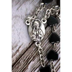 Este terço tem lindas contas de hematita em forma de coração cinza. A peça central apresenta Nossa Senhora do Monte Carmelo de um lado e o Sagrado Coração de Jesus no outro. É oxidado pela prata, assim como o crucifixo. Mede 42 cm do centro das contas até a ponta do crucifixo. Fabricado na Itália. Sagrado Coração de Jesus é uma devoção ao verdadeiro coração físico de Jesus como uma representação de seu amor divino pela humanidade. A devoção enfatiza o amor absoluto, a compaixão e a longanimidade do coração de Jesus pela humanidade. Marca: San Gregorio - Artigos Religiosos
