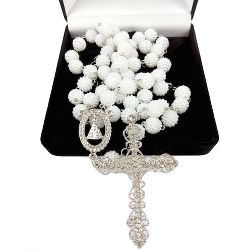 Terço De Noiva Prata Perolas Brancas Framboesa