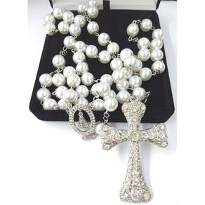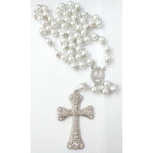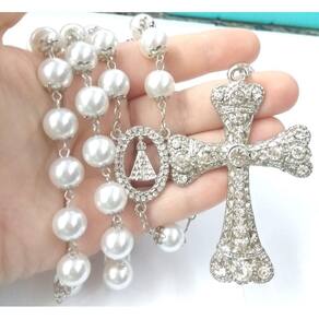 Terço de Noiva confeccionado com pérolas brancas ABS de 12mm, não descascam e não deformam. Cada pérola é apoiada por tulipas de 8mm e os Pai-Nossos revestidos com tulipas duplas. Cruz prata cravejada com Strass Preciosa medindo 8,5 cm de altura e 5,5 cm de largura. Entremeio de Nossa Senhora Aparecida cravejada com Strass Preciosa medindo 3,5 cm de altura e 2,3 cm de largura. A medida do terço esticado é de aproximadamente 78 cm. O terço é acomodado em uma fina caixa de veludo.