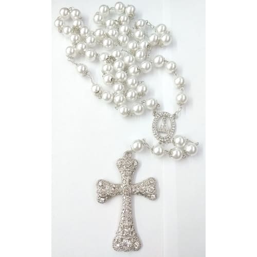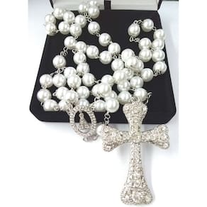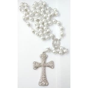 Terço de Noiva confeccionado com pérolas brancas ABS de 12mm, não descascam e não deformam. Cada pérola é apoiada por tulipas de 8mm e os Pai-Nossos revestidos com tulipas duplas. Cruz prata cravejada com Strass Preciosa medindo 8,5 cm de altura e 5,5 cm de largura. Entremeio de Nossa Senhora Aparecida cravejada com Strass Preciosa medindo 3,5 cm de altura e 2,3 cm de largura. A medida do terço esticado é de aproximadamente 78 cm. O terço é acomodado em uma fina caixa de veludo. Marca: Evangelize