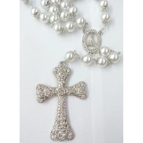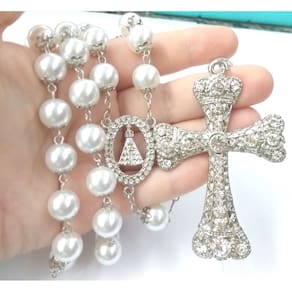 Terço de Noiva confeccionado com pérolas brancas ABS de 12mm, não descascam e não deformam. Cada pérola é apoiada por tulipas de 8mm e os Pai-Nossos revestidos com tulipas duplas. Cruz prata cravejada com Strass Preciosa medindo 8,5 cm de altura e 5,5 cm de largura. Entremeio de Nossa Senhora Aparecida cravejada com Strass Preciosa medindo 3,5 cm de altura e 2,3 cm de largura. A medida do terço esticado é de aproximadamente 78 cm. O terço é acomodado em uma fina caixa de veludo. Marca: Evangelize Ean: 0606529006396