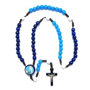 Tamanho da bolinha: 8 mm. Tamanho do Crucifixo: 3,2 cm. Tamanho do Terço inteiro: 40 cm. Material: Madeira. Acabamento: Verniz brilhante. Cor: Dois tons de azul com Pai-Nossos brancos.