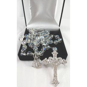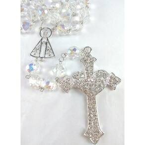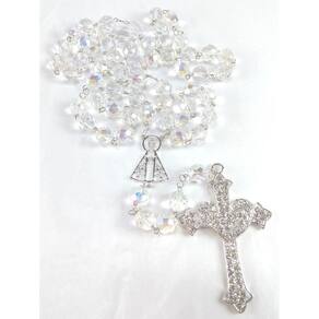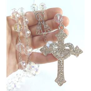 Terço de Noiva confeccionado com cristais boreal tchecos preciosa de 12mm. Cruz Coração com Banho de Prata cravejada de Strass Preciosa medindo 8,0 cm de altura e 5,0 cm de largura. Entremeio de Nossa Senhora Aparecida vazado medindo 3,65 cm de altura e 2,5 de largura. A medida do terço esticado é de aproximadamente 80 cm. O terço é acomodado em uma fina caixa de veludo. Marca: Evangelize
