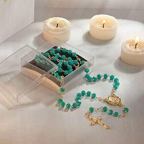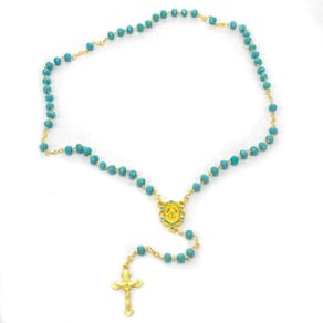 Terço Nossa Senhora das Graças Cristal Vidro Luxo Turquesa Nossa Senhora das Graças: Esse titulo se apresentou a uma noviça, em Paris, que ao rezar na capela, recebeu a revelação da Virgem Maria como Nossa Senhora das Graças. Desse encontro surgiu a chamada medalha milagrosa pelas palavras de Nossa Senhora. Material: Contas em cristal vidro 6,5 mm Metais em dourado Resina Tamanho: 41 cm de comprimento Embalagem: Caixa acrílica Dimensões aproximadas do produto. Marca: Amém Decoração Religiosa Ean: 7899347277601