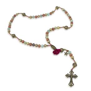 Terço Nossa Senhora de Guadalupe Madeira 8mm Material: Contas em madeira 8 mm contas em pedra natural 8 mm metais em ouro velho Strass Cordão Flor de papel Marca: Não Informado Ean: 7899347040618