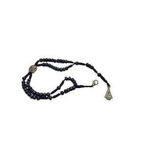 - Terço. - Contas em plástico número 8. - Medalhas em zamac na cor níquel e resinada. - Com fecho para por no pescoço no tom níquel. - Fio de nylon. - Contas em madeira número 6. - Com fecho em níquel. - Cruz e entremeio em madeira. - Hematita Nº 4. - Acompanha: Terço e embalagem.