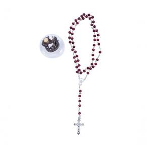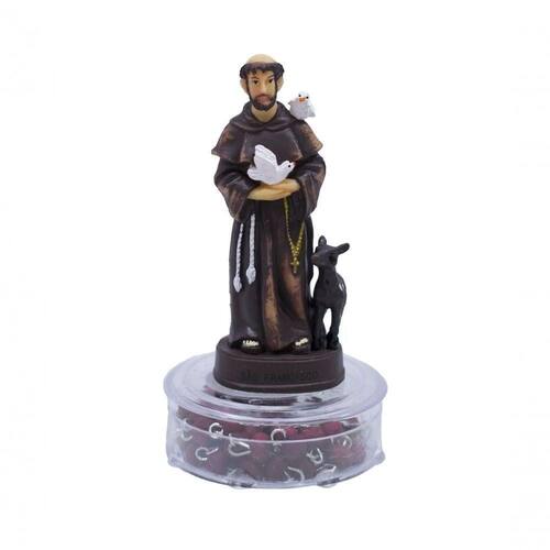 Imagem decorativa em forma de São Francisco com 10 cm de altura (medido com a base de plástico). Vem com terço com contas vermelhas. Material: resina plástica