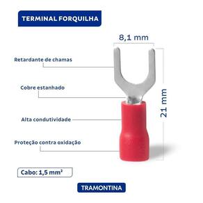 Com tecnologia de ponta para fixação, os terminais de conexão forquilha Tramontina em cobre estanhado e nylon 1,5 mm x 8,1 mm x m5 vermelho 100 peças garantem conexões seguras e eficientes para seus projetos elétricos. Fabricados com cobre estanhado de alta condutividade e revestidos em nylon, oferecem resistência e durabilidade. Pacote com 100 peças.