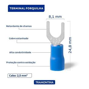 Terminal para conexão elétrica com dimensão de 8,1 mm x M5 e seção de 2,5 mm.