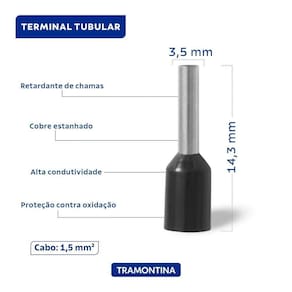 Desenvolvido com alta qualidade, os terminais de conexão tubulares Tramontina em cobre estanhado e nylon 1,5 mm x 8 preto 100 peças garantem conexões seguras e eficientes para seus projetos elétricos. Fabricados com cobre estanhado de alta condutividade e revestidos em nylon, oferecem resistência e durabilidade. Pacote com 100 peças.
