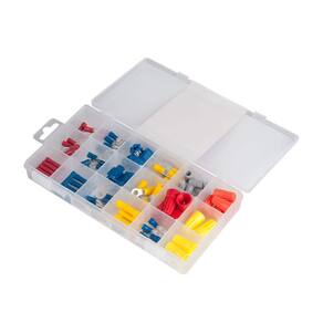 - O kit de 80 peças inclui: 7 conectores cinza, 5 conectores laranja, 4 conectores amarelos e vermelhos, 5 terminais de anel vermelho, azul e amarelo, 5 terminais de pá vermelhos, azuis e amarelos, 5 desconexões masculinas azuis, 5 desconexões femininas azuis, 5 emendas vermelhas, azuis e amarelas, 5 emendas azuis