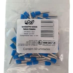 Terminal Pré-Isolado Pino Tubular 2,5mm - Azul - 50 Unidades - G20 Terminal Pré-Isolado Pino Tubular, normalmente é utilizado em terminação de cabo de cobre flexível para bornes em instalações elétricas em geral (residencial, predial ou industrial). Alta condutibilidade elétrica e resistência à corrosão. Ótimo contato elétrico. Área de conexão por compressão.