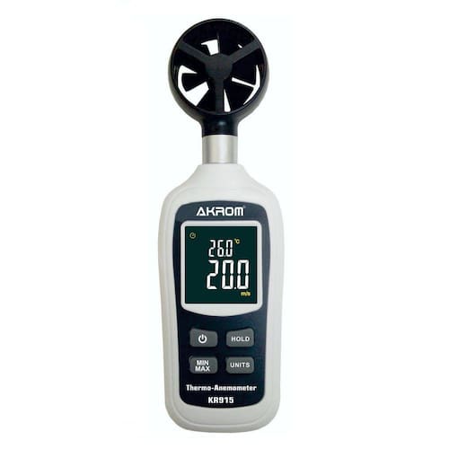 DESCRIÇÃO GERALO KR915 mede a temperatura do ar e a velocidade do vento em várias unidades de medida m/s, km/h, ft/min, mph e knots . Possui um inovador visor LCD colorido com backlight, o que lhe confere design elegante. Registra os valores máximos MAX e mínimos MIN , além de permitir o congelamento da indicação no visor função HOLD .ESPECIFICAÇÕES TÉCNICASTEMPERATURA: Faixa de medição: -10 a 60ºC Resolução: 0.1ºC Exatidão: +/- 1.5ºCVELOCIDADE: Faixa de medição: 0.4 a 30 m/s Resolução: 0.1 m/s Exatidão: +/- 4%Temperatura de operação: -10 a 60ºCUmidade de operação: 10 a 90%UR sem condensação Alimentação: 4.5V 3 pilhas AAA Dimensões L x A x P : 56 x 179 x 31 mmPeso: 100 gRECURSOS PRINCIPAIS- Seleção ºC / ºF- Seleção da unidade de medida de velocidade- Visor LCD colorido de dupla indicação- Registros de máximas MAX e mínimas MIN - Congelamento da indicação no visor HOLD - Desligamento automático após 15 min configurável - Indicação de bateria fracaITENS INCLUSOS- 3 pilhas AAA- Manual de instruções em português