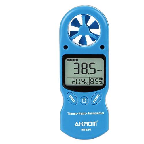 O KR825 mede a temperatura ambiente, a umidade relativa do ar e a velocidade do vento em várias unidades m/s, km/h, ft/min, knots e mph . Possui um amplo visor LCD de tripla indicação com iluminação no fundo backlight . Registra os valores máximos MAX , mínimos MIN e médios AVG ocorridos, além de permitir o congelamento das indicações no visor função HOLD . Permite que o usuário realize o ajuste das 3 grandezas calibração local , de modo a reduzir eventuais desvios na indicação e aumentar a sua exatidão.