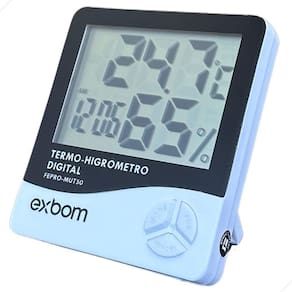 Termo - higrômetro digital com registro de máxima e mínima Funções termômetro, higrômetro e relógio Indica temperatura e umidade do ambiente Com suporte para colocar em mesa e furação para pendurar parafuso não incluso Alimentação: 1 pilha aaa inclusa Indicação em ºc ou ºf Escala de -50ºc a 50ºc / -58ºf a 158ºf / 10% a 99%rh 12h/24h com alarme Precisão: 1ºc / 5%rh Tamanho: 9,5 largura x 11cm altura x 2,5cm profundidade