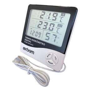 Escala de medição interna: -10ºC até 50ºC -14ºF até 122ºF Escala de medição externa: -50 a 70C -58ºF até 158ºF Precisão de medida: +- 1ºC 1,8ºF Resolução de temperatura: +- 0,1ºC 0,2ºF Faixa de medição de umidade: 20% até 99% RH Precisão de umidade: +- 5% RH Resolução de umidade: 1% Unidade de temperatura em ºC e ºF Memória de temperatura máxima, mínima e umidade Relógio, despertador e data Aviso de horas Alimentação: 1 Pliha AAA 1,5v inclusa Dimensões aproximadas do produto: 98 x 106 x 23 mm LxAxP Comprimento do sensor: 1,5 m