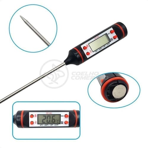 Termômetro digital para alimentos com desligamento automático. Mede a temperatura de alimento em graus célsius e fahrenheit com extrema precisão e rapidez. Perfeito para medir a temperatura de prato em banho maria no forno e outros. Seu display em LCD facilita a visualização das informações de modo claro e nítido junto de seu material de alta durabilidade e resistência que garante uma vida útil muito mais longa e durável para o produto.