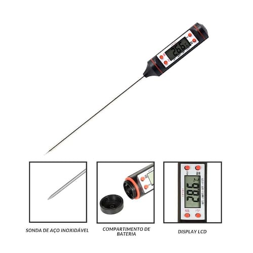 ESPECIFICAÇÕES: - Material: Aço inox e plástico - Medição: -50 a 300C - Taxa de erro: 1C - Voltagem: 1.5v