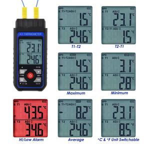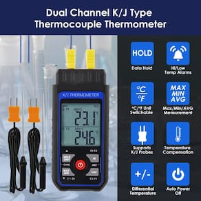 Termômetro digital de termopar, termopar, medidor de HVAC, registrador de dados de termopar, termômetro de alta temperatura, termômetro com sonda de temperatura, termopar tipo J, termopar tipo k, termômetro de canal duplo, leitor de termopar tipo k, termômetro tipo k duplo, termômetro com termopar, sonda tipo J - Ampla faixa de medição de temperatura: a faixa de medição de temperatura do termômetro da unidade principal é de -328 a 1,371.7 °C (-200 a 1372°C), e a faixa de aço inoxidável das sondas tipo K é: -58 a 700.0 °C (-50 a 700 °C), os termopares tipo contas (o azul Cor: – Atende perfeitamente aos requisitos do usuário para testes de superaquecimento ou sub-resfriamento. É uma ferramenta ideal para HVAC, forno micro-ondas, aquário, equipamento de refrigeração, etc - Canal duplo com 4 pares térmicos: nosso termômetro tipo K oferece dois canais de medição simultânea de temperatura T1 e T2, com dois tipos de termopares, quatro peças de sondas (2 peças de sondas tipo K de aço inoxidável + 2 peças de sondas tipo miçanga) que permitem a medição de temperatura diferencial de canal duplo - ALARME DE FLASH DE ALTA / BAIXA TEMPERATURA: Este termômetro termopar possui função de alarme de flash alto e baixo, que permite que você saiba instantaneamente que os valores de temperatura atuais estão sobrecarga ou menores do que seus limites predefinidos - Medidor versátil: este medidor de termopar K e J tem uma tela LCD HD grande com luz de fundo que permite leituras duplas de temperatura para facilitar a leitura, mesmo em áreas escuras. Unidades de temperatura °C e ? comutáveis, medidas tipo K e J comutáveis, retenção de dados, média mínima máxima, função de desligamento automático ou não - A compensação ADJ garante a medição de precisão: este medidor de temperatura HAVC integrado com sensor térmico de alta qualidade garante uma medição de alta precisão e estabilidade. Basta pressionar os botões [Hi] e [Low] juntos, o usuário pode ajustar o valor de compensação ADJ (intervalo de -9 a 9 ? / 15,8 a 9.0 °C) para concluir o procedimento de calibração