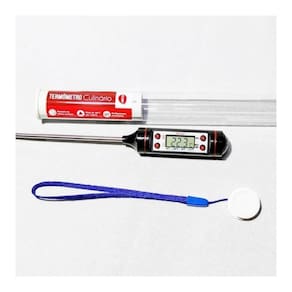 Especificações: Termômetro Culinário Digital Espeto Alimentos Cozinha - Mede de -50C a +300C- Escala: 0,1 C- Bateria 1,5V AG13 (Inclusa)- Tamanho: 23cm- Modo de economia de energia: desliga automaticamente após 10 minutos sem uso. principais botões:- Ligar/desligar, centígrados/Fahrenheit e Função Hold (Fixa última medição)- Memória da última medição- Desligamento automático para economia de energia Instruções 1- Pressione o Botão Hold para fixar a temperatura quando estiver medindo e pressione novamente para iniciar uma nova medição.2 - Pressione C e F para selecionar a escala que deseja utilizar.3 - On/Off - Liga e desliga o aparelho4 - Max/Min. Mostra a maior e a menor temperatura medida.