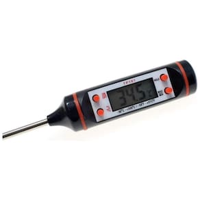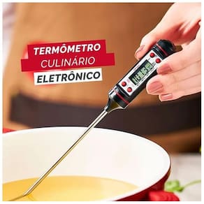Termômetro Digital Culinário Sobre o produto: Termômetro Culinário Digital Liquido Alimento Cozinha Clink Alimentos queimados, secos, sem suculência , muito quente ou muito frio NUNCA mais, use para cozinhar, verificar a temperatura correta de líquidos e de alimentos sólidos. O termômetro culinário é uma ferramenta de medição muito útil usada para medir a temperatura interna de alimentos como carne, assados e líquidos, ou outros alimentos cozidos. Pode detectar temperaturas precisas. Especificações: Termômetro Culinário Digital Espeto Alimentos Cozinha - Mede de -50ºC a +300ºC- Escala: 0,1 ºC- Bateria 1,5V AG13 Inclusa - Tamanho: 23cm- Modo de economia de energia: desliga automaticamente após 10 minutos sem uso. principais botões:- Ligar/desligar, centígrados/Fahrenheit e Função Hold Fixa última medição - Memória da última medição- Desligamento automático para economia de energia Instruções 1- Pressione o Botão Hold para fixar a temperatura quando estiver medindo e pressione novamente para iniciar uma nova medição.2 - Pressione ºC e ºF para selecionar a escala que deseja utilizar.3 - On/Off - Liga e desliga o aparelho4 - Max/Min. Mostra a maior e a menor temperatura medida. Itens Incluso: 01 Termômetro Culinário