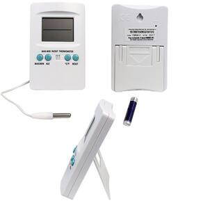 DESCRIÇÃO Termômetro digital com memória para 30 temperaturas com máx/mín e hora. É Indicado para a monitorização simultânea de duas temperaturas, podendo ser de geladeira, estufa, freezer, balcão frigorífico, ambiente, laboratório,aquário, agropecuária avicultura, suinocultura e criatórios em geral , caixa térmica, transporte de vacinas e refrigeração em geral. Conservação: Armazenar em local limpo e seco. Itens inclusos: Termômetro digital Max/Min Digital ; 1 pilha Aaa; Manual do Usuário; Medidas do produto - Altura : 11 cm - Largura: 7 cm - Espessura: 2 - Peso: 100 g Marca: Jprolab Marca: Não Informado