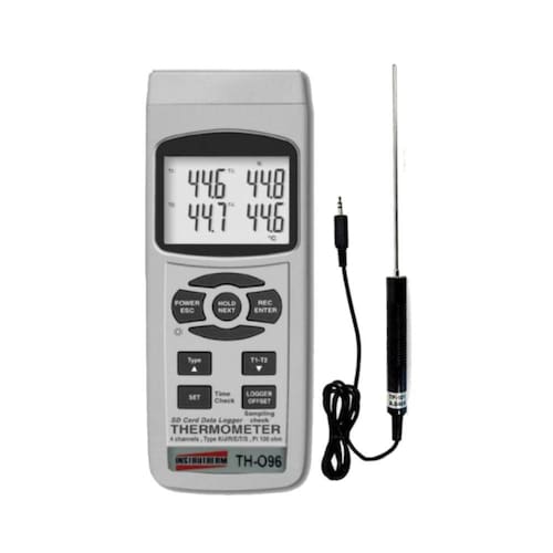 KIT TERMÔMETRO DIGITAL PORTÁTIL TIPO K E J C/ SAÍDA RS-232 E DATALOGGER MOD TH-096 + SENSOR DE TEMPERATURA MOD.ST-250 DESCRIÇÃO: Termômetro digital portátil tipo k e j c/ saída rs-232 e datalogger mod th-096 Sensor de temperatura mod.st-250 ESPECIFICAÇÕES TÉCNICAS: TERMÔMETRO TH-096: Display de Cristal Líquido (LCD) de 5 dígitos Escala do Sensor Tipo K: 1000 a 1300°C a resolução é de 1°C e a precisão ± (0.4 % +1°C) 50.1 a -100.0 ? a resolução é de 0,1°C e a precisão ± (0.4 % + 0.5 °C) 50.0 a 999.9 ? a resolução é de 0,1°C e a Precisão ± (0.4 % + 0.5 °C) 58.1 a -148.0 ? a resolução é de 1 °F e a precisão ± (0.4 % + 1.8 °F) 58.0 a 999.9 ? a resolução é de 1 °F e a precisão ± (0.4 % + 1 °F) 1000 a 2372 ? a resolução é de 1 °F e a precisão ± (0.4 % + 2 °F) Escala do sensor Tipo J: 50.1 a -100.0 ? a resolução é de 1°C e a precisão ± (0.4 % +1°C) 50.0 a 999.9 ? a resolução é de 1°C e a precisão ± (0.4 % + 0.5 °C) 1000 a 1150 ? a resolução é de 1°C e a precisão ± (0.4 % + 1 °C) 58.1 a -148.0 ? a resolução é de1°F e a precisão ± (0.4 % + 1.8 °F) 1000 a 2102 ? a resolução é de1°F e a precisão ± (0.4 % + 2 °F) Tipo de sensor: Sensor Termopar Tipo K ou J ou Pt-100 Canais de entrada: 4 canais, T1, T2, T3 e T4 Tempo de resposta: Aprox. 1 segundo Interface Serial: RS-232 Data logger com capacidade de armazenar até 16000 dados Data Hold: Congela a leitura no display Memória: Máxima e Mínima Desligamento automático ou manual Temperatura de operação: 0 a 50ºC Umidade de operação: Menor que 85% R.H Alimentação: 6 pilhas de 1,5V "AAA" ou adaptador de 9V Dimensões: 174 x 68 x 42mm Peso: 278g (apenas o equipamento). Nota: Para alimentar o instrumento, utilizar pilhas ou adaptador, nunca utilizar os dois juntos. SENSOR ST-250: Escala: -50~400ºC (classe A) Sensor Tipo (PT-100 - 0HM Temp PROBE) Sensor utilizado no modelo TH-096. ACESSÓRIOS FORNECIDOS: Termômetro Digital TH-096 Sensor de temperatura ST-250 Manual de instruções