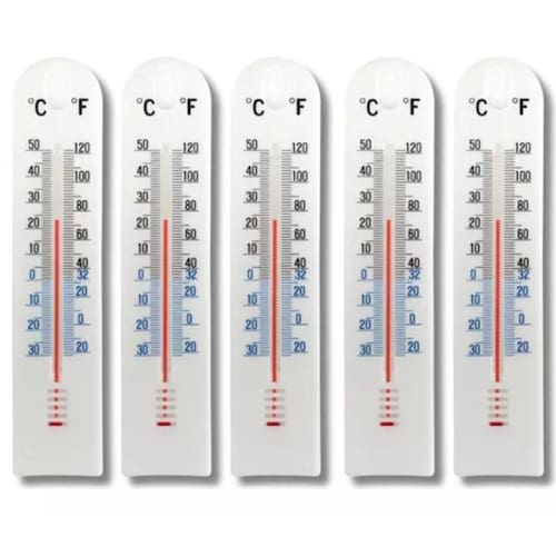 Termometro de alta qualidade na cor branca, feito com plástico, querosene e vidro. Graduação celsius e fahrenheit, com faixa de temperatura de 40c a + 50c, divisão 1c sem mercúrio.